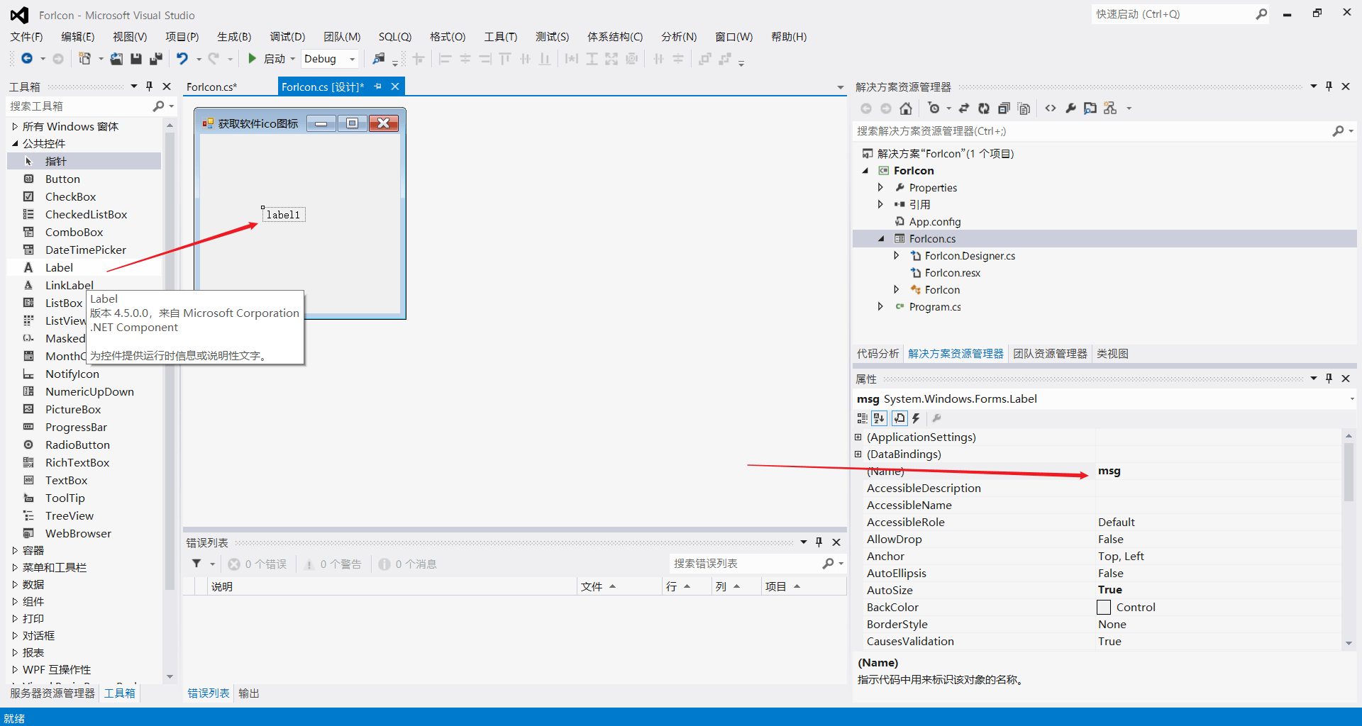 然后再右边的解决方案资源管理器里将 Form1.cs 重命名为ForIcon.cs