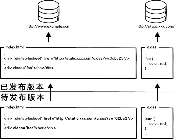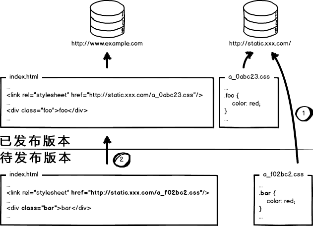 - 在二者部署的时间间隔内,如果有用户访问页面,就会在新的页面结构中加载旧的资源,并且把这个旧版本的资源当做新版本缓存起来,其结果就是:用户访问到了一个样式错乱的页面,除非手动刷新,否则在资源缓存过期之前,页面会一直执行错误。