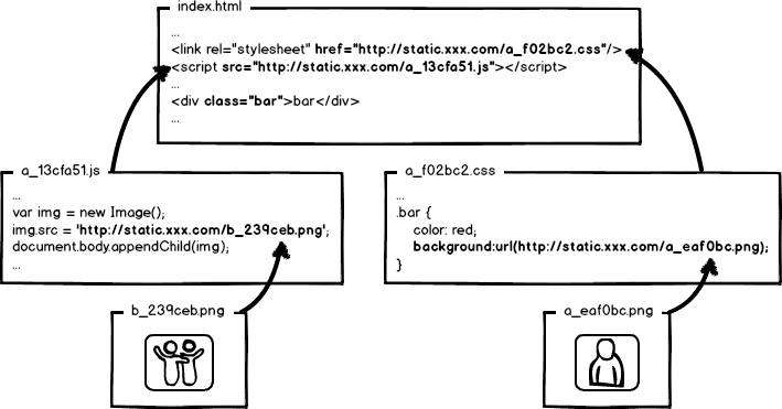 全套做下来,就是相对比较完整的静态资源缓存控制方案了,而且,还要注意的是,静态资源的缓存控制要求在前端所有静态资源加载的位置都要做这样的处理。是的,所有!什么 js、css 自不必说,还要包括 js、css 文件中引用的资源路径,由于涉及到摘要信息,引用资源的摘要信息也会引起引用文件本身的内容改变,从而形成级联的摘要变化,大概就是如下图