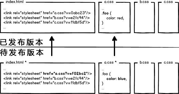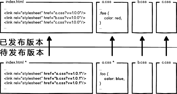 页面引用了 3 个 css,而某次上线只改了其中的 a.css,如果所有链接都更新版本(当然你如果只改 a 的链接地址就可以了,不过我们还是要继续讨论后续问题),就会导致 b.css,c.css 的缓存也失效,那岂不是又有浪费了?!